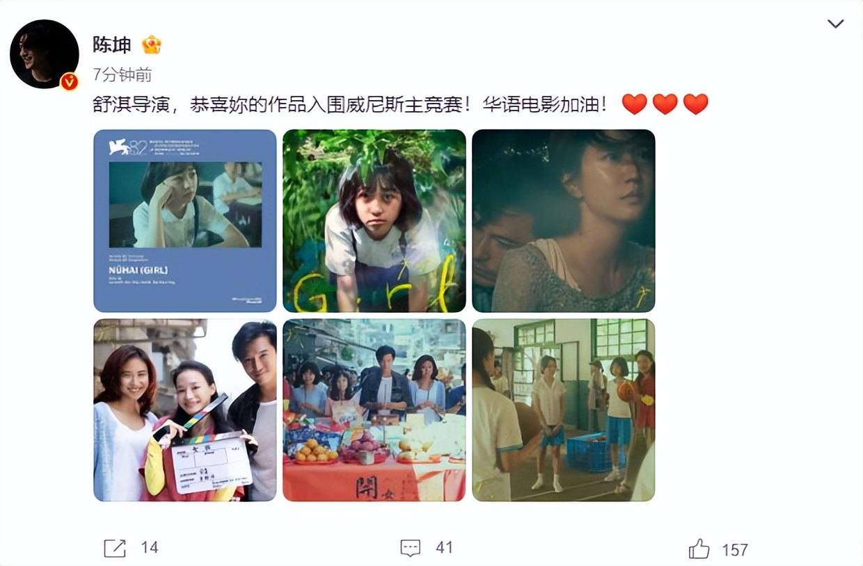 《女孩》入围威尼斯国际电影节主竞赛单元消息传出后,舒淇好友、演员陈坤发文祝贺,“舒淇导演,恭喜你的作品入围威尼斯主竞赛,华语电影加油!”