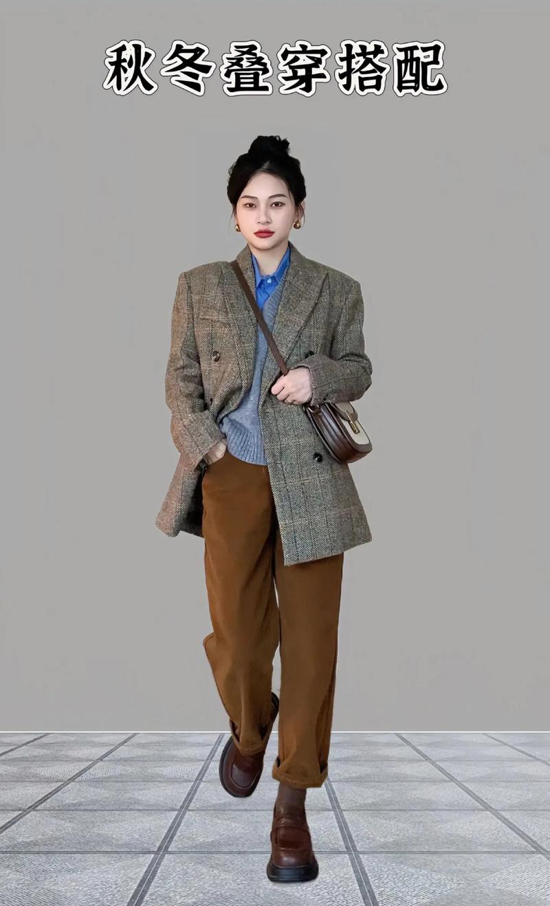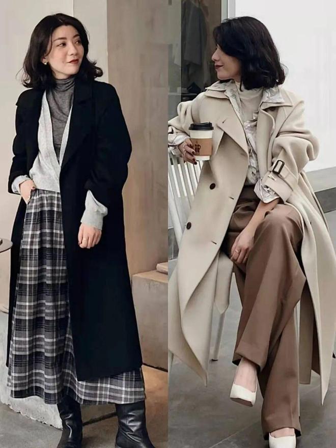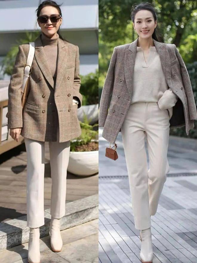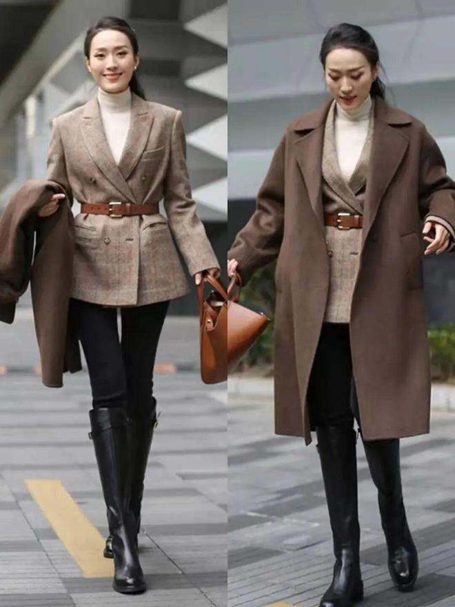 比如纯色高领打底衫叠穿西装,再搭配毛呢大衣,这种温柔软糯的组合特别适合冬季营造温婉气质,色调统一,整体看起来协调又显温柔。