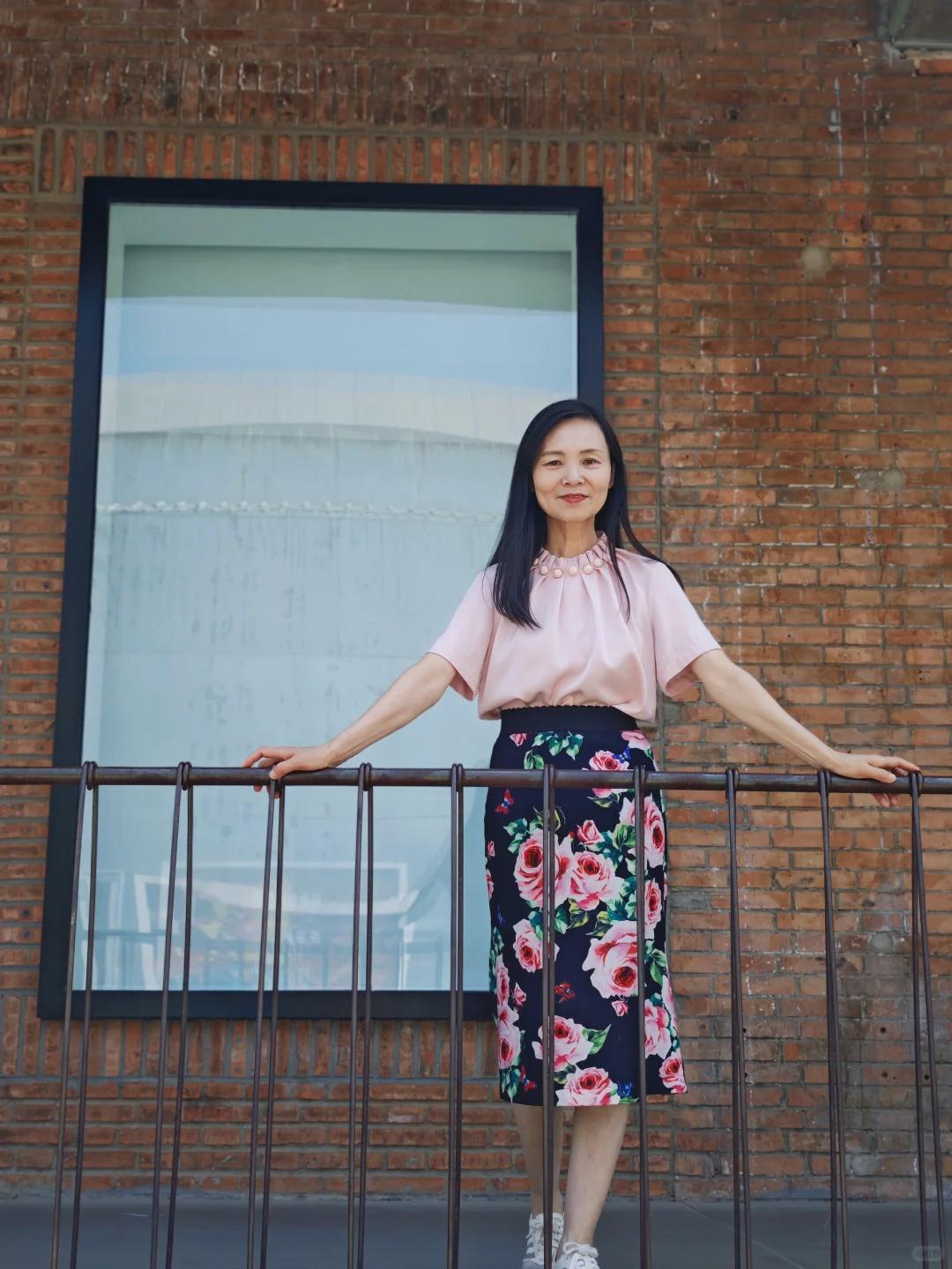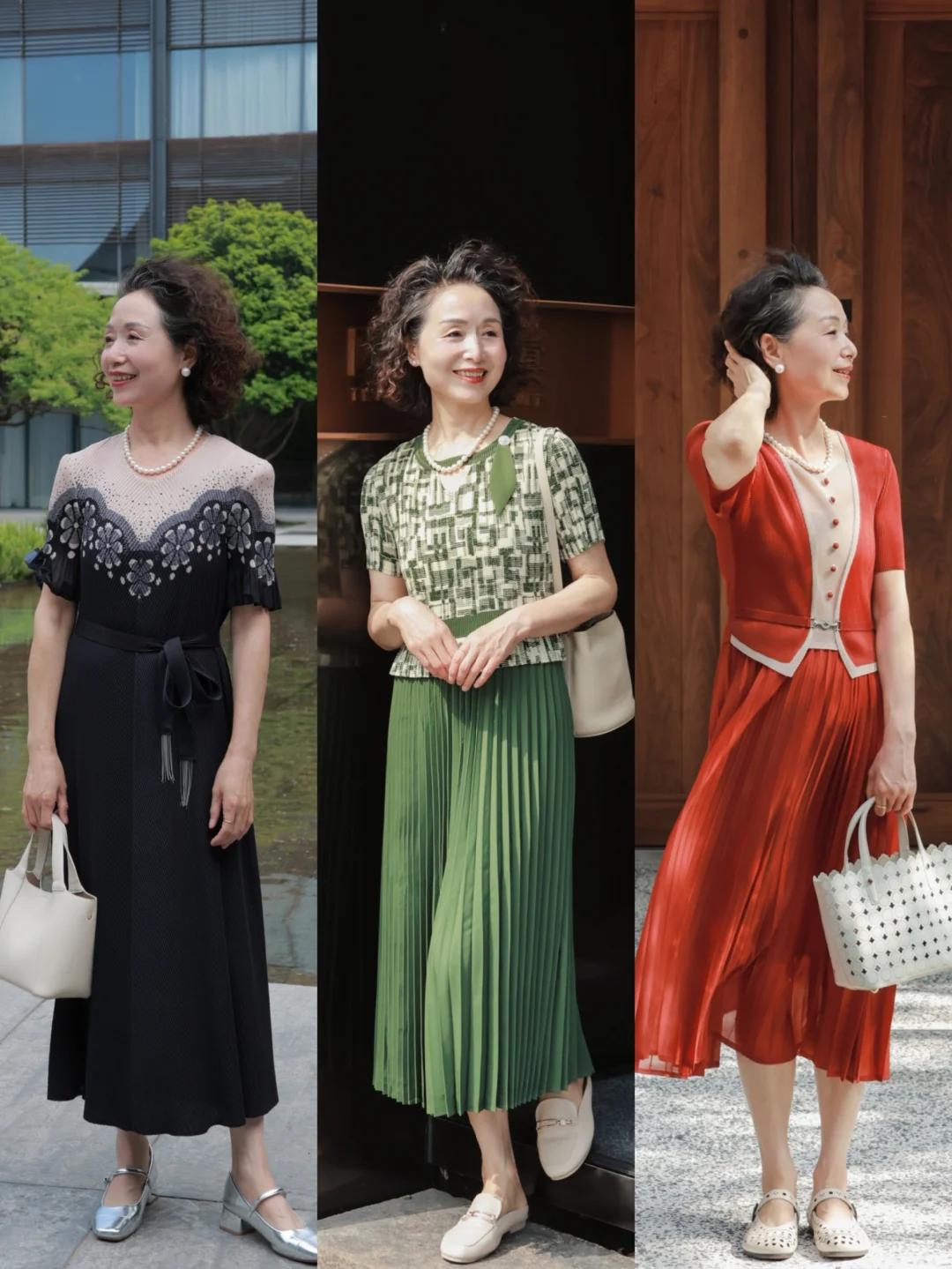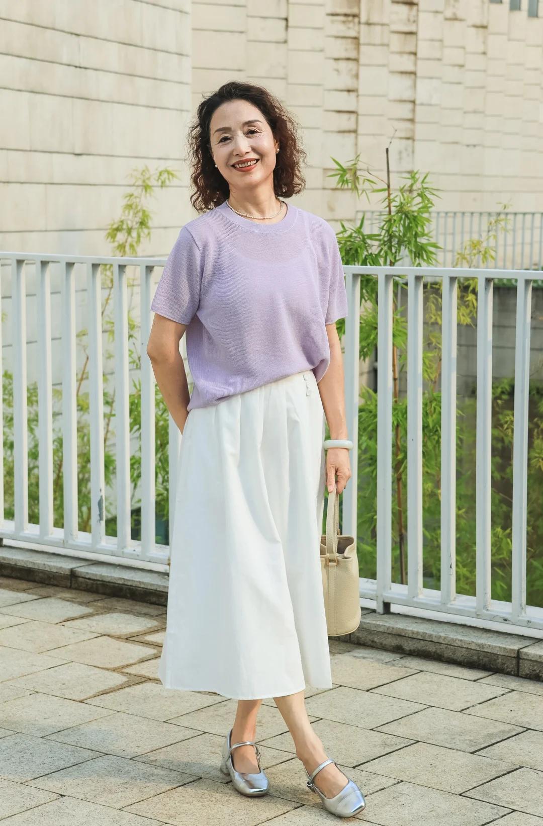 “裙子长上衣短”的搭配公式,能充分利用一短一长的组合,彰显出身形的三七分比例。在盛夏季节,裙装比裤装更具实用性,而宽松的裙装搭配又能满足大龄女性对穿搭舒适度的需求。