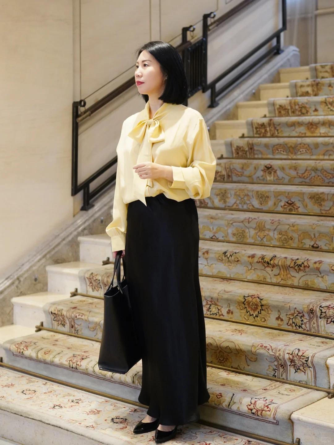 其实,选择基础黑白灰单品时,巧妙结合一些亮眼元素是个不错的办法。比如黑色半身长裙,可以搭配黄色飘带衬衫,领口的飘带元素设计能为整体造型增添精致感。但要注意,使用面积不宜过大,色彩设计也不能过于繁杂,以免破坏整体的简约感。