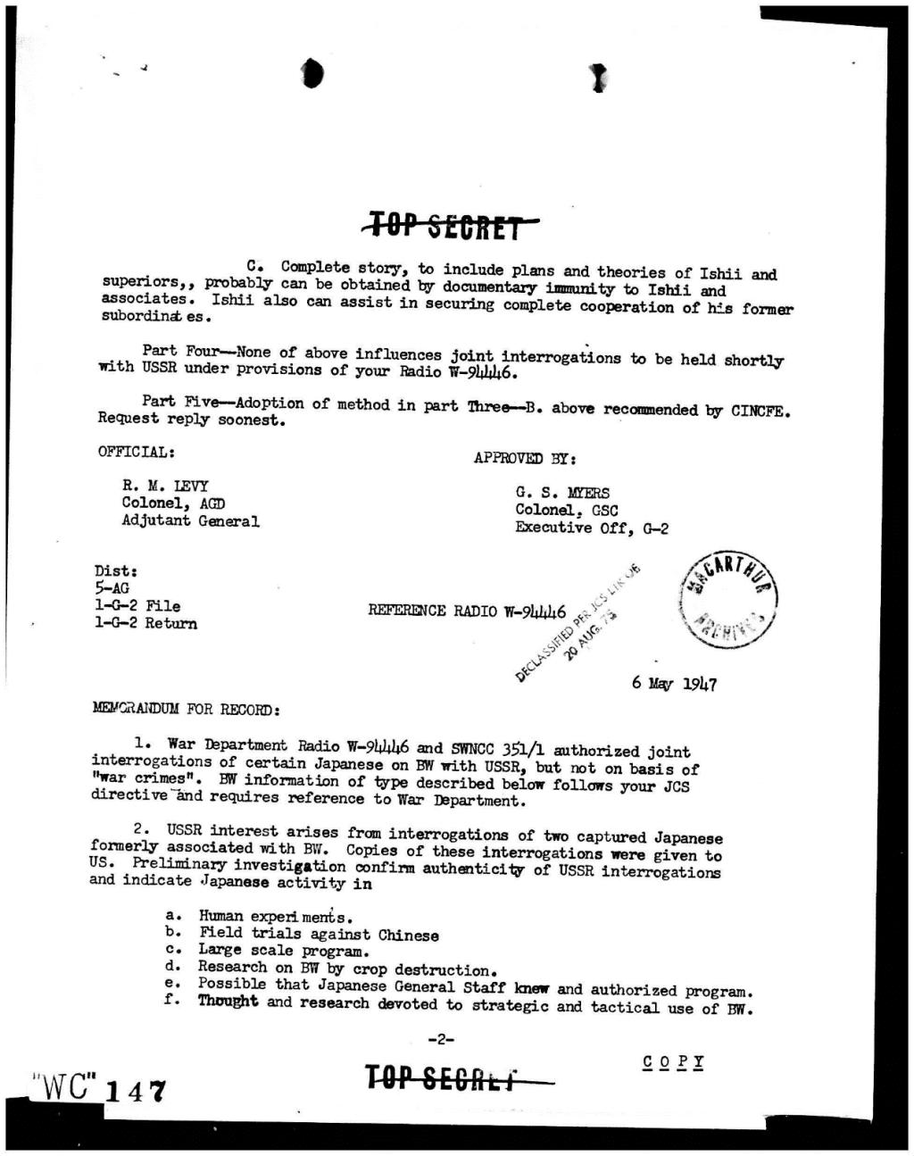 1947年 5月 6日,美国远东司令部给美国陆军部情报总局发送的军事急电 C-52423之二(美国国家档案馆藏) 《731:医学的沦陷》一书插图