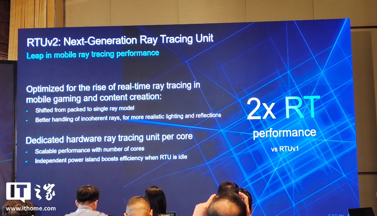 Arm 在发布会上公布了引人注目的性能指标:依托全新的 SME2 技术,CPU 的 AI 性能实现了高达五倍的提升;而全新的 GPU 则带来了两倍的光线追踪性能飞跃。