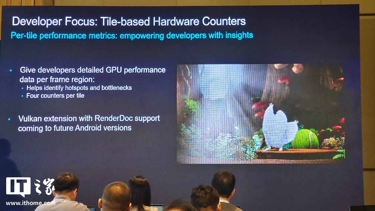 在开发者工具层面,Mali G1 系列通过基于块(tile)的硬件计数器提供更强的可观测性,开发者可通过 Vulkan 扩展访问这些计数器,未来安卓版本还将支持 RenderDoc,便于精准识别性能热点、平衡工作负载。