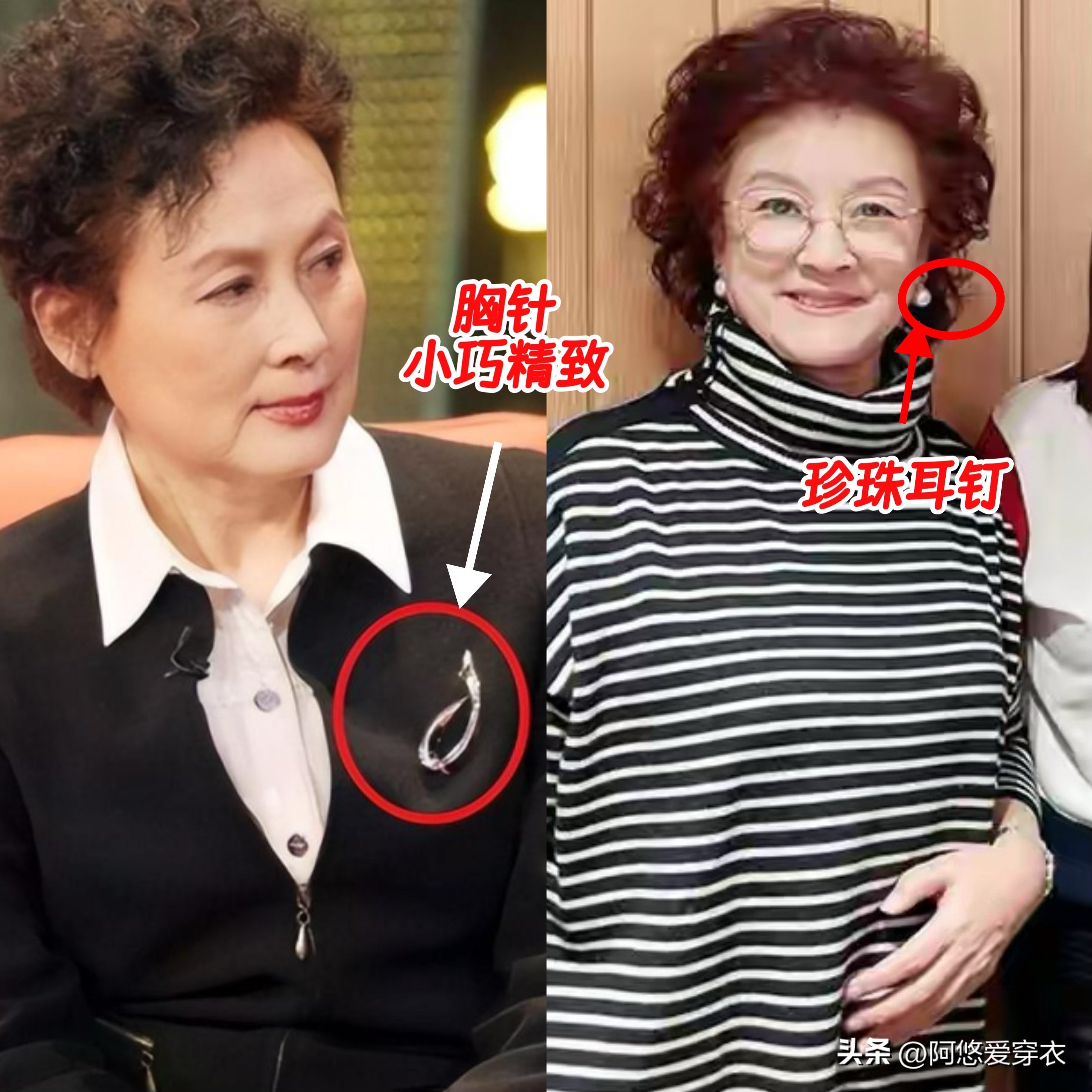 ↓你看向梅和宋春丽的造型里,很少出现夸张的珠宝首饰,她们更爱搭配珍珠耳钉,银胸针,款式小而精,用来点缀穿搭刚刚好,一点不突兀。