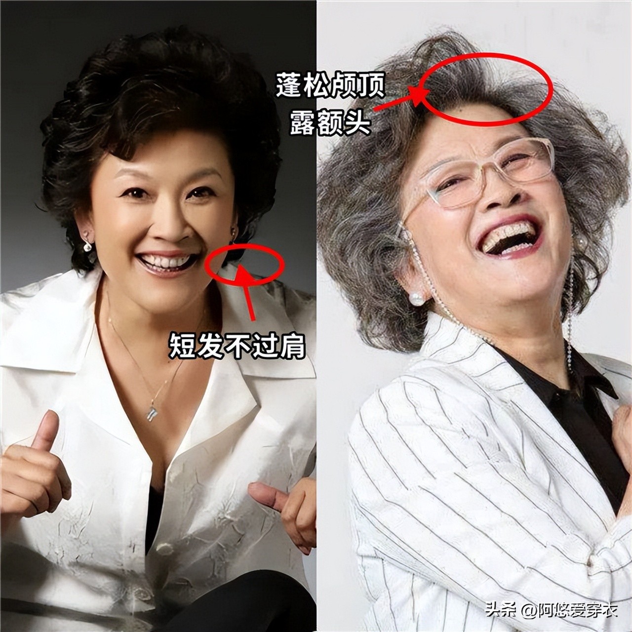 再看宋春丽、向梅她们老了的发型,都是这种自然蓬松的微卷,头顶5cm处开始烫卷,打造出自然的高颅顶,显得发量多,五官也很立体。