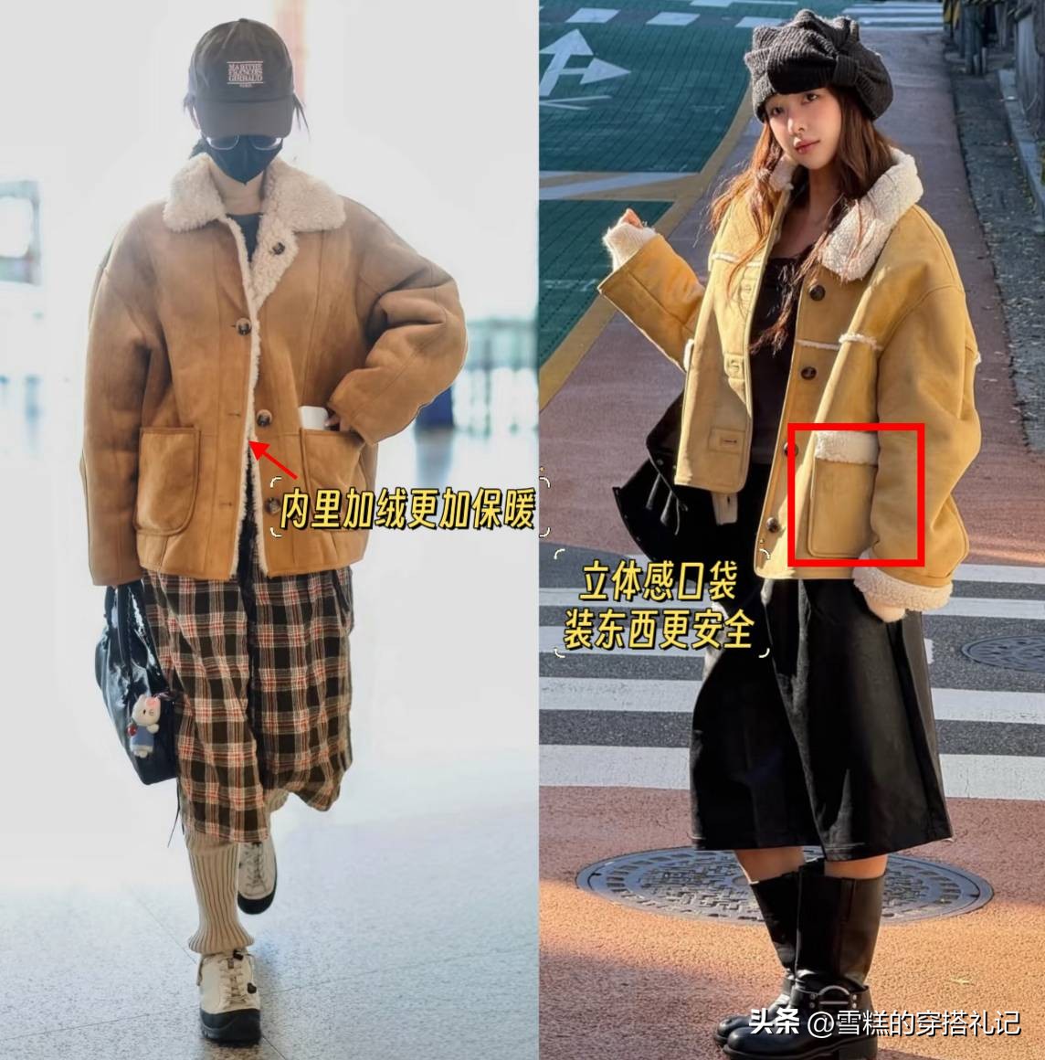 麂皮绒质感柔软,复古感拉满,搭配上大尺寸的毛领,一直延伸至衣襟位置,兼顾保暖性、装饰性,轻松凸显出精致感,搭配短裙、牛仔裤都好看。