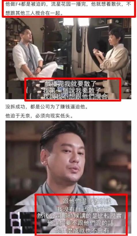 他说“做F4让我感到痛苦”,还吐槽F4的歌不好听,唱多了会厌烦。