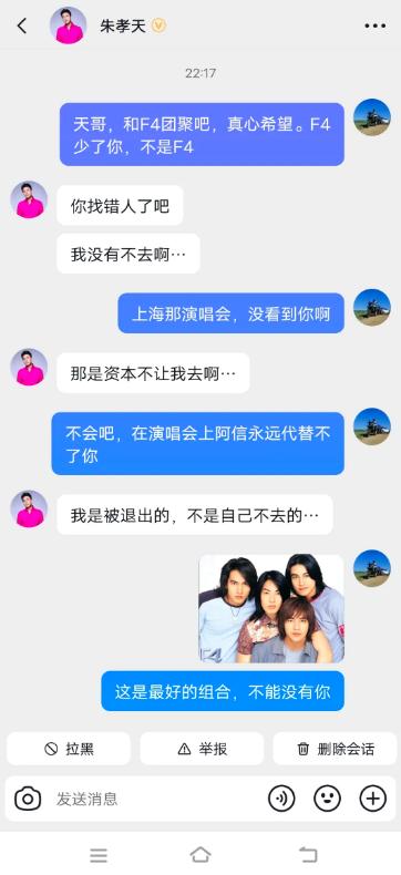 可朱孝天偏不,直接在粉丝群里嘲讽阿信说的是“场面话”。