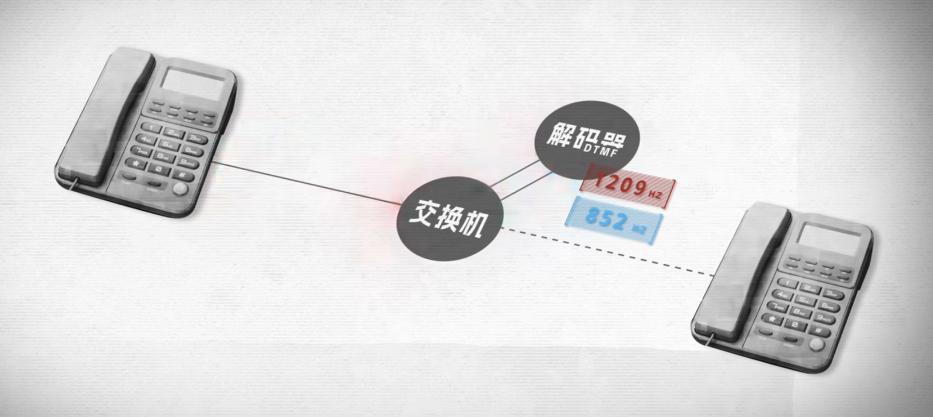 当你在按电话号码时,交换机会持续监听这串音频信号,然后传送给 DTMF 解码器。 解码器再把这个音频还原成两个频率,再根据拨号盘的排布来匹配具体的号码。