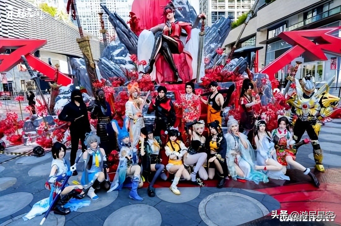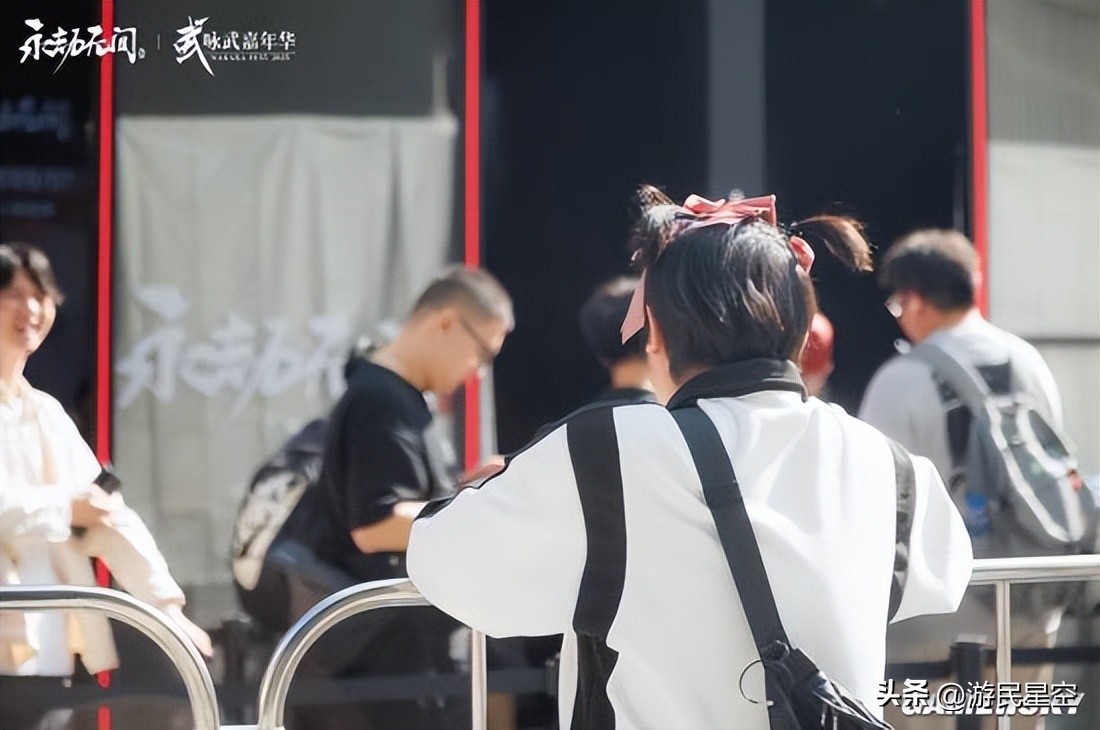 走进咏武嘉年华现场,映入眼帘的便是游戏标志性角色“宁红夜”的一座8米高的巨型雕像;其下方宽阔的台阶周围,簇拥着玩家们熟悉的“返魂花”,层层叠叠铺展成一片醒目的红色。