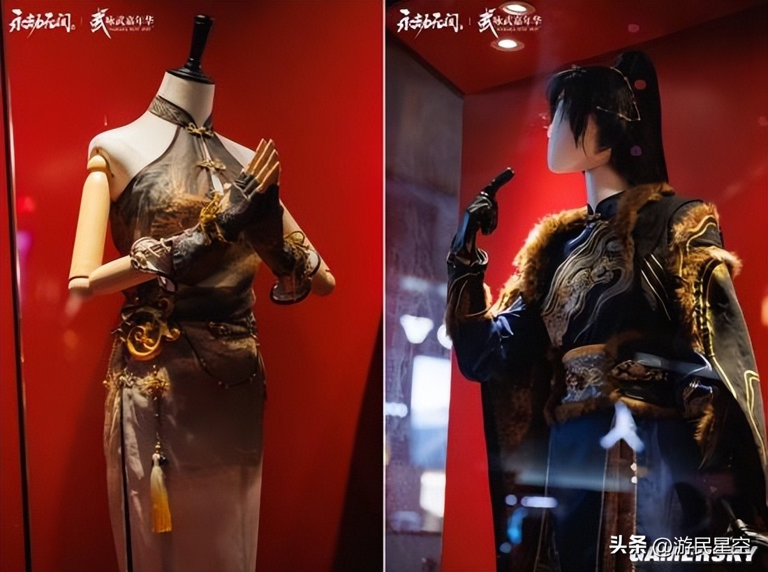 在场区中心,同样矗立着许多根据游戏内外观等比例还原的服饰展览:它们之中,既有以少数民族服饰为灵感的创作,也有与文物企划联动的特别设计,其中更不乏展现中式武道哲学与美学的独特服饰,共同勾勒出《永劫无间》武侠世界中鲜活的文化图景。