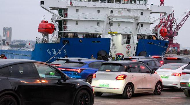 1月26日,在海南省海口市秀英港,新能源车辆排队驶入新能源车专用运输船“绿源二号”。2025年春运期间,当地每天计划安排至少20个新能源专班航次,可保障3500辆新能源车进出岛,有效缓解高峰时段新能源汽车过海运输压力。 新华社记者 杨冠宇 摄