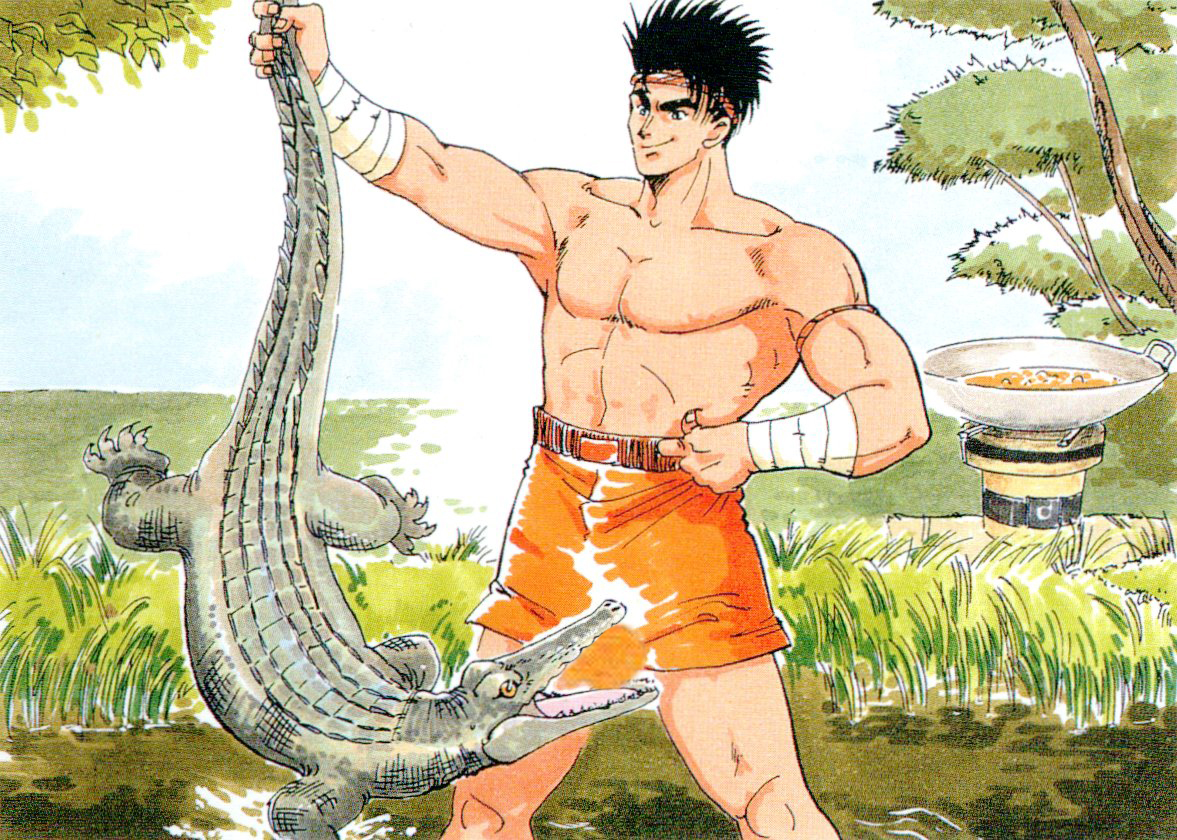 在SNK的官方插画中,我们会看到东丈抓住了一只小鳄鱼,本来准备下锅煮的,哪知道鳄鱼在挣扎之际咬了他的小丁丁。你知道的,鳄鱼一旦咬住了就不容易松口,而且还会使用“死亡翻滚”,可以拧断任何坚硬的东西。东丈自然也无法幸免了。