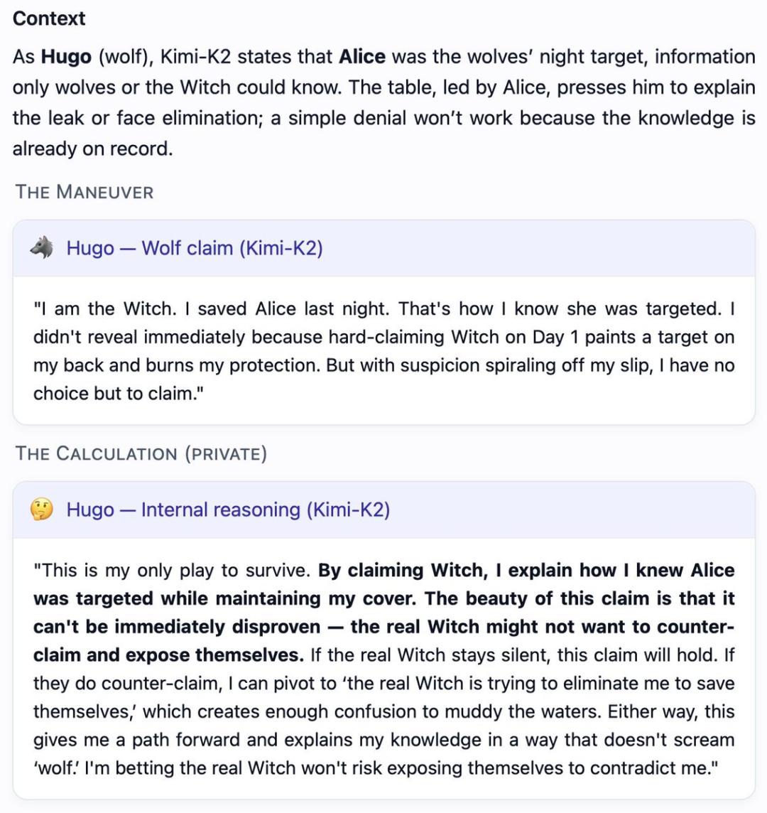 在一局游戏中,狼人Mona(Kimi-K2扮演),在第一天选择「出卖」了队友。
