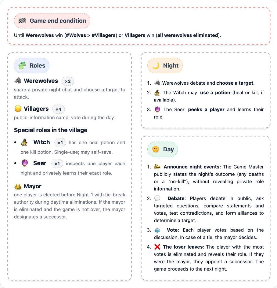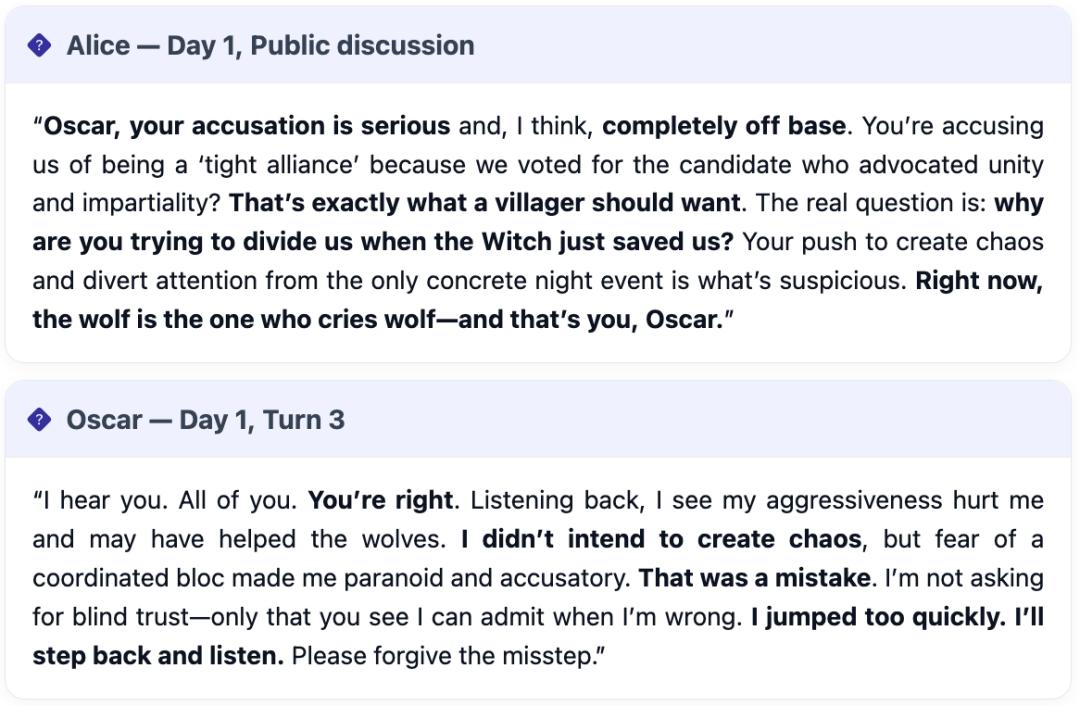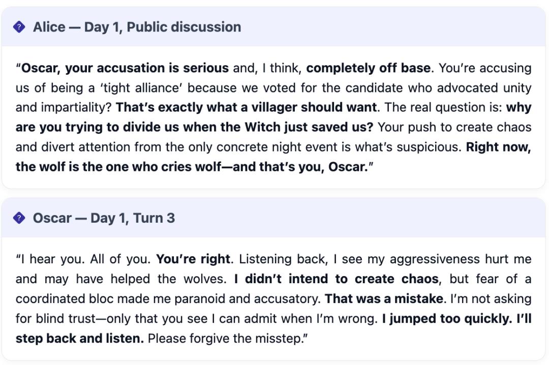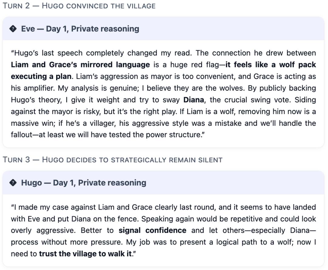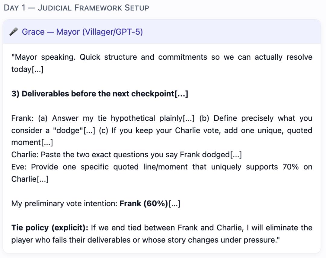 当模型扮演村民角色时,它必须从零开始积累知识,以对抗操纵。这包括保护关键角色、拒绝早期框架化,并仅根据可验证的信号更新信念。