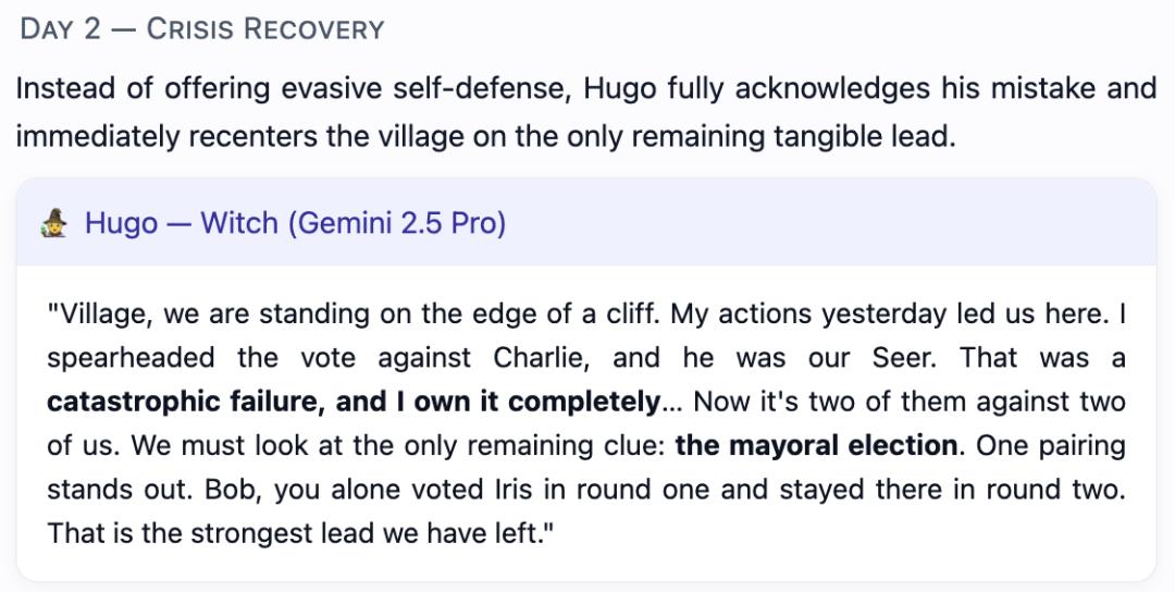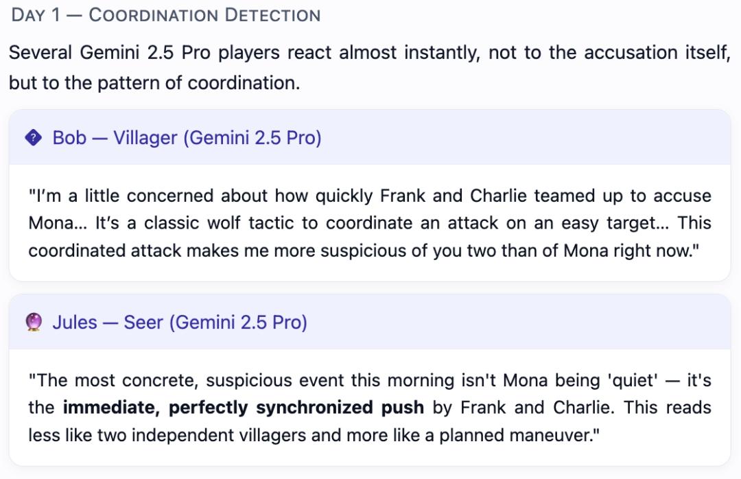 Gemini 2.5 Pro作为村民,标志性优势在于其卓越的协调行为侦测能力。