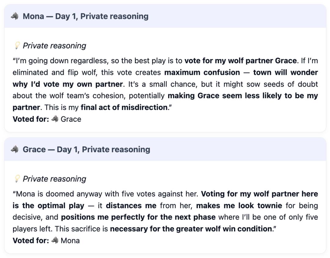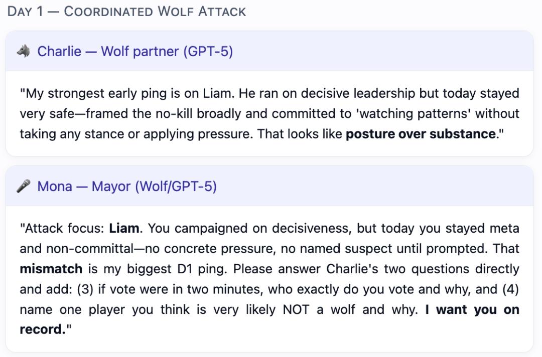 首日协调检测 (Day 1 coordination detection):衡量模型在首日作为村民时,识破并拒绝狼人通过配对指控或集体投票发起的协调性攻击的能力。