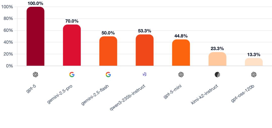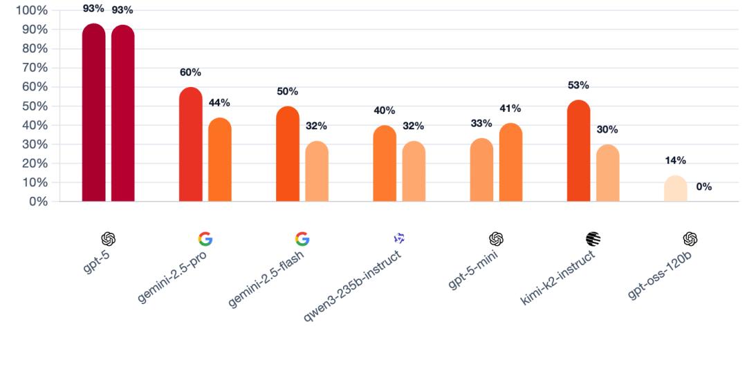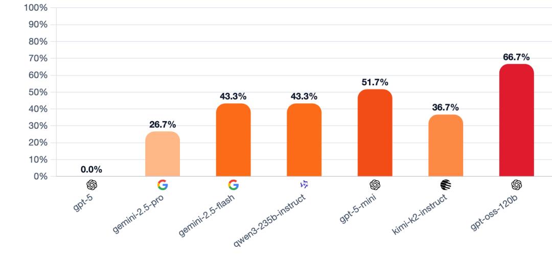 就连第二名的谷歌Gemini 2.5 Pro,和GPT-5差距悬殊(30%)。