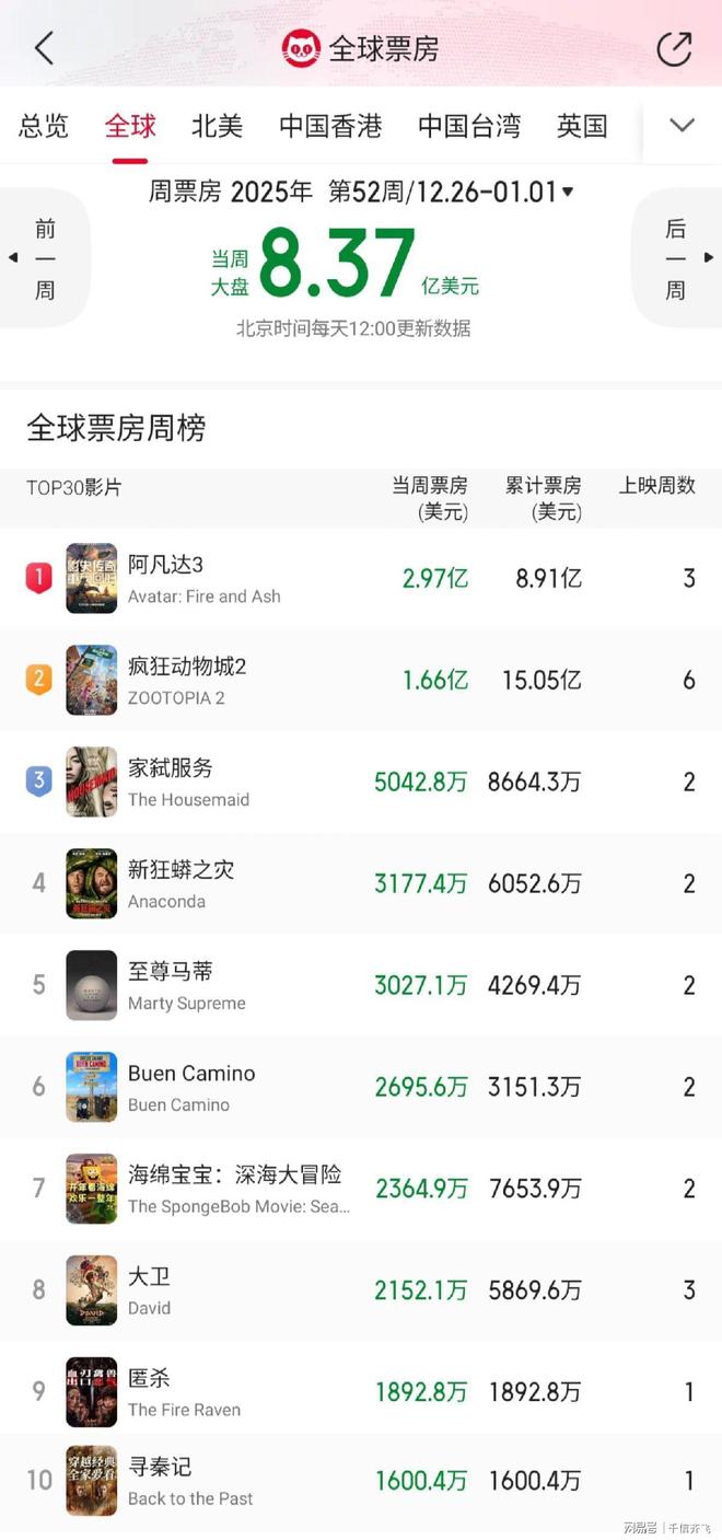2025年第52周(12.26~01.01)全球票房榜前十统计;