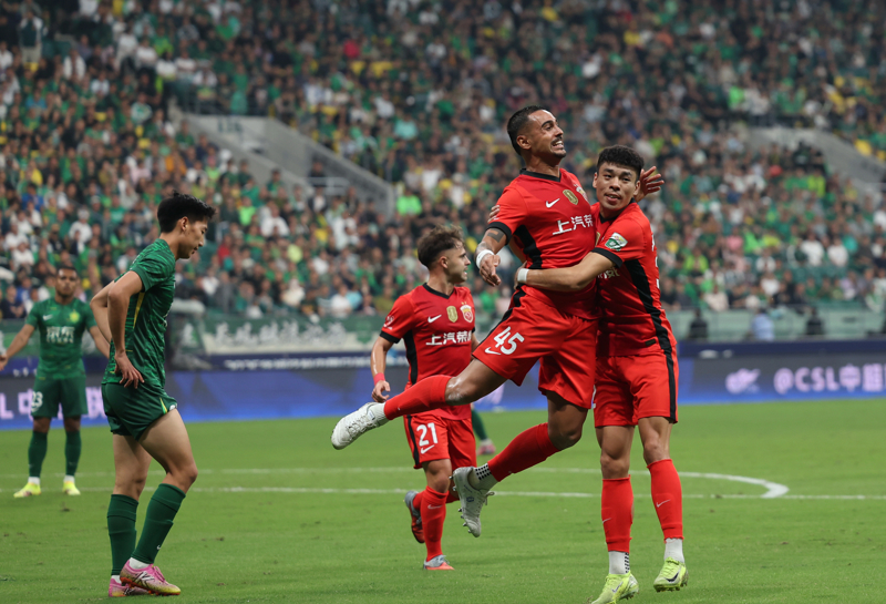 9月21日,上海海港队球员莱昂纳多(右二)进球后庆祝。 当日,在北京工人体育场举行的2025赛季中国足球超级联赛第25轮比赛中,北京国安队主场2比3不敌上海海港队。 新华社 发