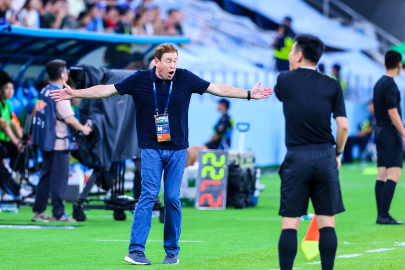 上海申花队主教练斯卢茨基(左)在场边指挥。 新华社发(彭志刚摄)
