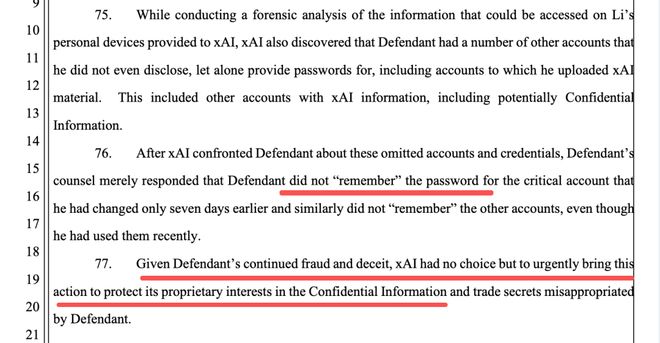 在xAI就这些被遗漏的凭证和账户向Li提出质疑后,Li的律师仅回应称,被告「不记得」关键账户的密码——即使他最近使用过这些账号。