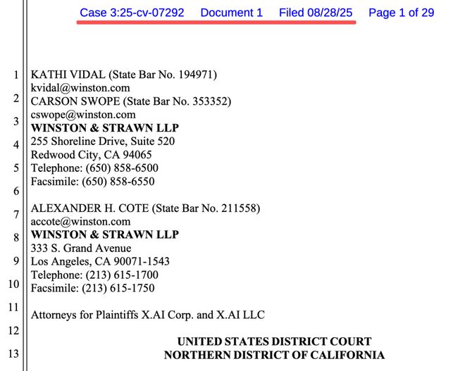 于是在8月28日,xAI正式对Xuechen Li提起诉讼,案件编号为3:25-cv-07292。