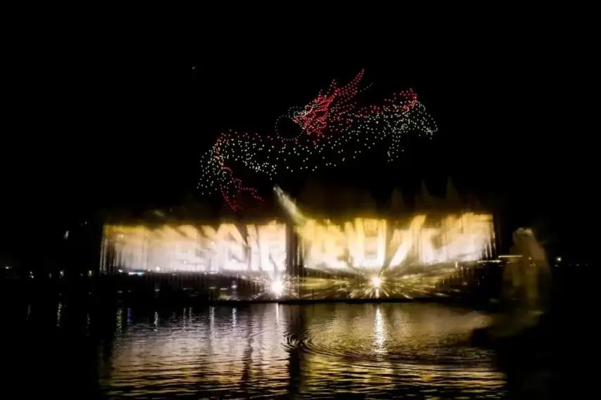 当天夜晚,借助激光水幕技术和无人机编排技术,官方在苏州·环秀湖畔献上了一场将湖水、光影与科技完美融合的无人机烟火水幕秀。