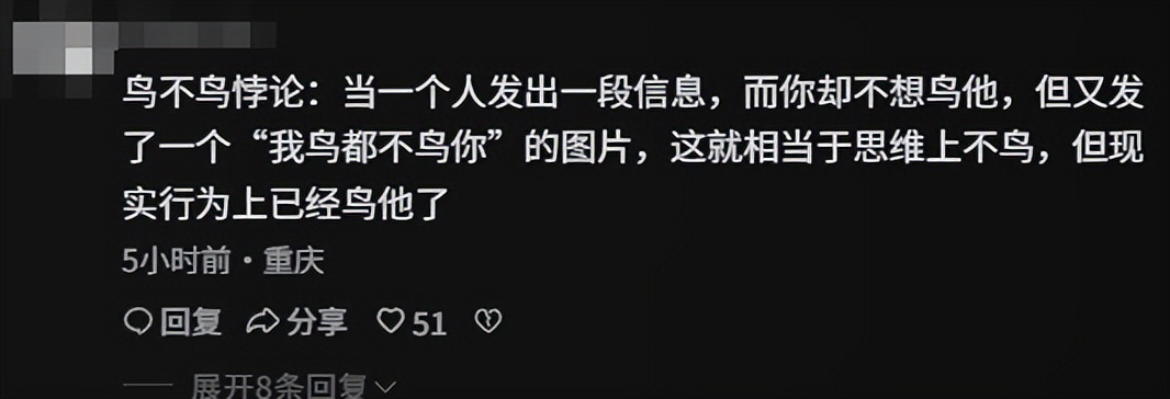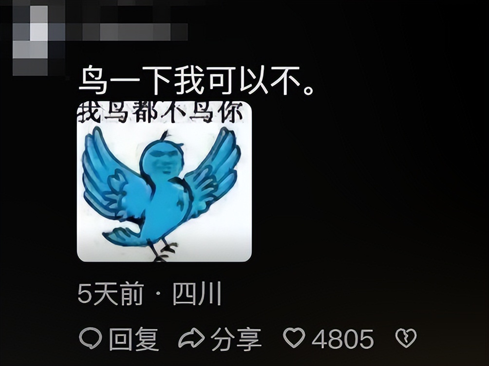 但话又说回来,没准你真可以把这图,当成另一种意义上的嘴替——当你在网上再看到各种降智内容,或遭遇他人中伤时,不妨直接把这张“我鸟都不鸟你”发过去,千言万语都不如一句顺从你了,这才能维护你内心深处的平静。