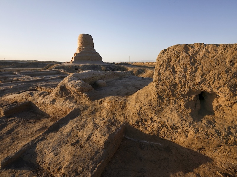 对于喀什,丁和念念不忘的是位于伯什克然木乡的莫尔佛寺。这是一处汉唐时期的佛教寺院遗址,为中国最西部始建年代最早、延续至唐末,且保存至今的一座大型土建筑地面佛寺遗址。在丁和拍摄的照片中,能看到现存一圆一方两座佛塔,体现了佛教在古代新疆地区传播和盛行的经历。