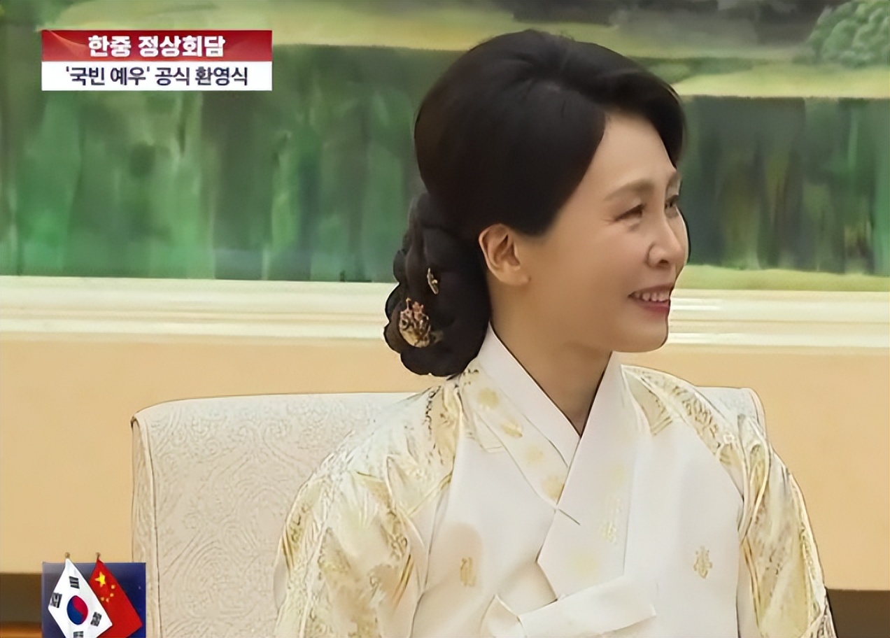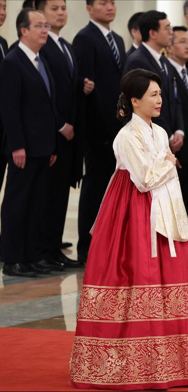 韩国第一夫人金惠景在访华的第二天,可真是放大招了,这身造型格外隆重,也是足以见得金惠景非常重视这次的欢迎仪式。