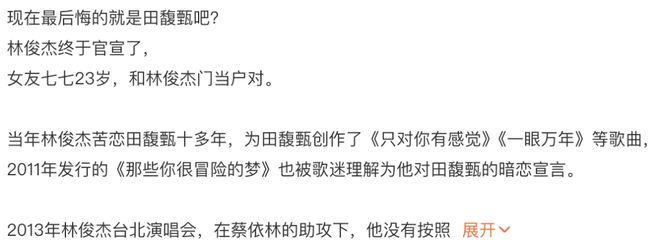这两天林俊杰追田馥甄的旧新闻还上了热搜,近期网上也出现很多夸男方踩女方没眼光的言论。但老瓜友都知道,田馥甄在感情方面跟林俊杰从来不可能发展到一起,从头到尾都是男方需要营销才搞出这个话题。炒的非常成功且让人印象深刻,同时也给田馥甄造成不少影响。