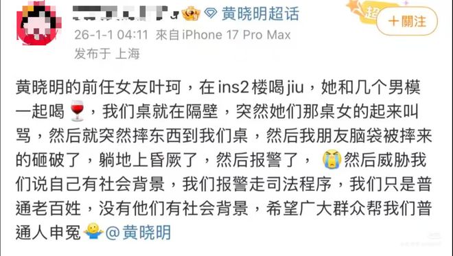 有网友发了条爆料,说看到叶珂在魔都点男模陪酒,网友那桌在她的隔壁,因为被叶珂那桌的人砸东西伤到,反过来还受到威胁,意思是不让叫JC蜀黍过来。这条内容最后还@黄晓明,发也是发在黄晓明的超话里的。