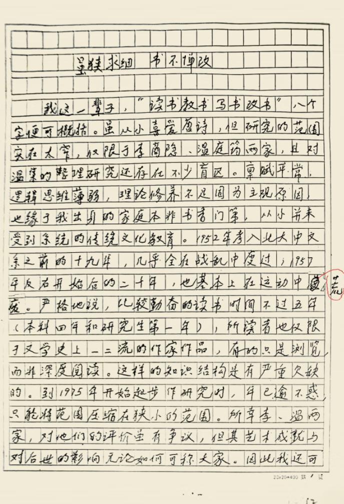 我这一辈子,用“读书、教书、写书、改书”八个字便可概括。虽从小喜爱唐诗,但研究的范围实在太窄,仅限于李商隐、温庭筠两家,且对温集的整理研究还存在不少盲区。禀赋平常,逻辑思维薄弱,理论修养不足,固为主观原因,也缘于我出身的家庭本非书香门第,从小并未受到系统的传统文化教育。1952年考入北大中文系之前的十九年,几乎全在战乱中度过;1957年反右运动开始后的二十年,也基本上在运动中荒废。严格地说,比较勤奋的读书时间不过五年(本科四年和研究生第一年),所读也仅限于文学史上一二流的作家作品,有的只是浏览,而非深度阅读。这样的知识结构是有严重欠缺的。到1975年开始起步作研究时,年已逾不惑,只能将研究领域压缩在狭小的范围内。所幸李、温两家,对他们的评价虽有争议,但其艺术成就与对后世的影响,无论如何可称大家。因此我还可在前人基础上继续细加钻研,取得一些成果。