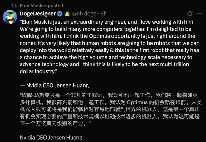 这不是胡说,毕竟马斯克同日转发了黄仁勋的「万亿美元」机器人产业的推文: