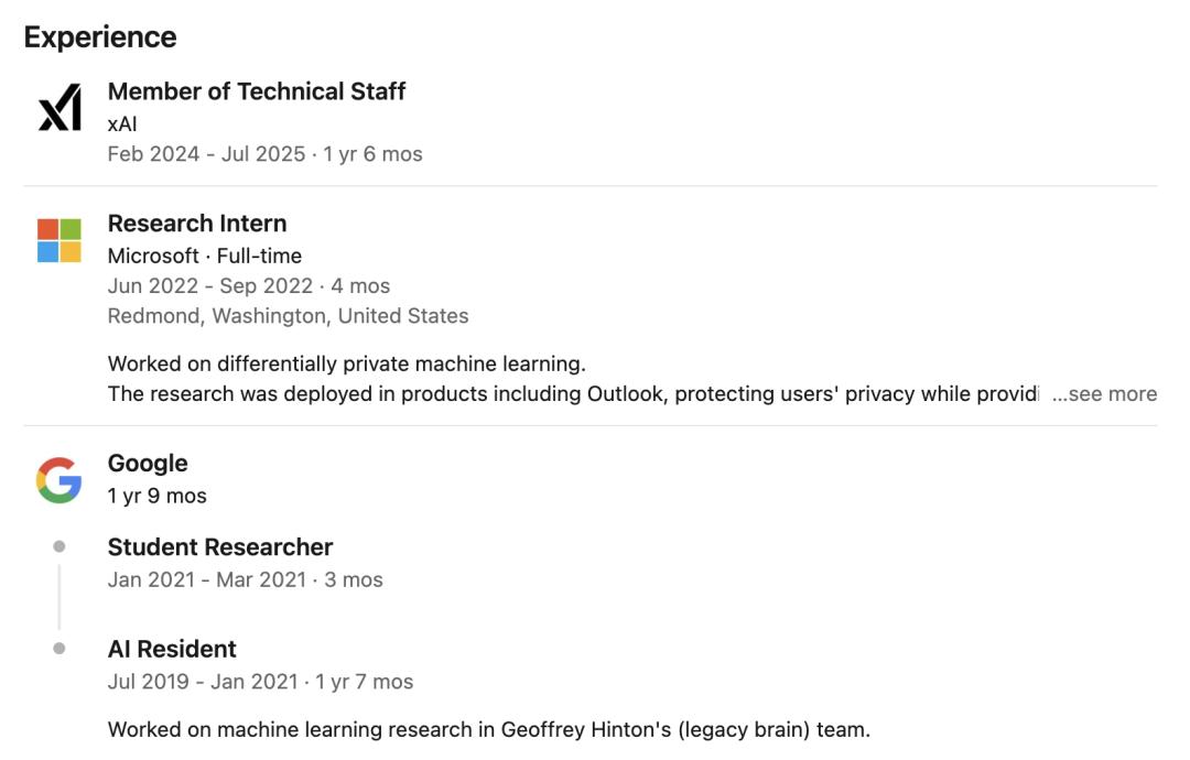 他去年从斯坦福毕业并取得取得计算机博士学位,当年2月就加入了xAI,此前曾在谷歌、微软实习。