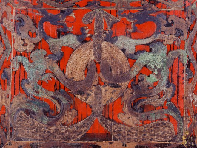 马王堆辛追墓朱地彩绘棺足挡悬璧纹