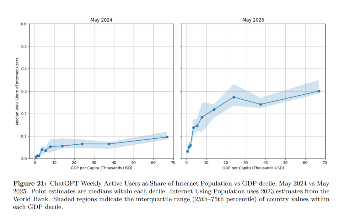 截至今年5月,ChatGPT在最低收入国家的使用增长率是最高收入国家的4倍以上。