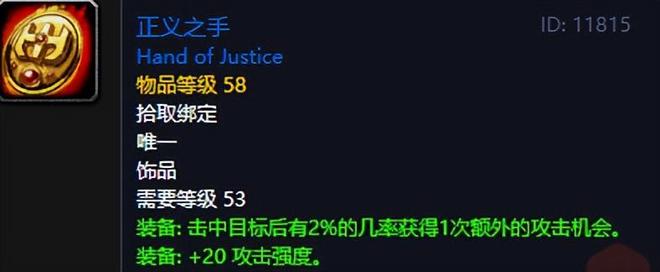 对于黑石深渊的正义之手,喵叔至今都没有弄明白一件事情,那就是到底什么时候他是将军掉落,又是在什么阶段他是索瑞森大帝掉落,有没有脑回路清晰一点的大兄弟来给喵叔捋顺了。对于这款饰品,不仅仅实用性非常强,对于脸黑或者排骨点的玩家,他的使用周期也是非常长,毕竟20点常驻攻击强度和被动的额外攻击收益都很稳定,当然喵叔感觉一般能够正常去黑石深渊刷到的玩家,还是少的,反正喵叔怀旧服战士是找人给带的,运气还是不错的,没几次就给拿下了。