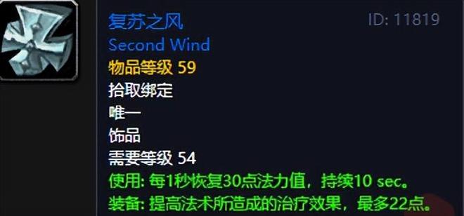 这款饰品就是高端治疗才能拿下的存在了,黑石深渊BOSS傀儡统帅阿格曼奇掉落,这东西不仅常驻的治疗效果高达22点,还有可控的法力值续航保障,真的是谁用谁知道的极品,而且54级就能佩戴也是能用到熔火之心没问题的超保值饰品了,不过这东西真的很少有治疗玩家能够佩戴,反正喵叔身边就没见过,包括喵叔牧师刷了几趟也没能拿下,入手难度颇为恐怖如斯!