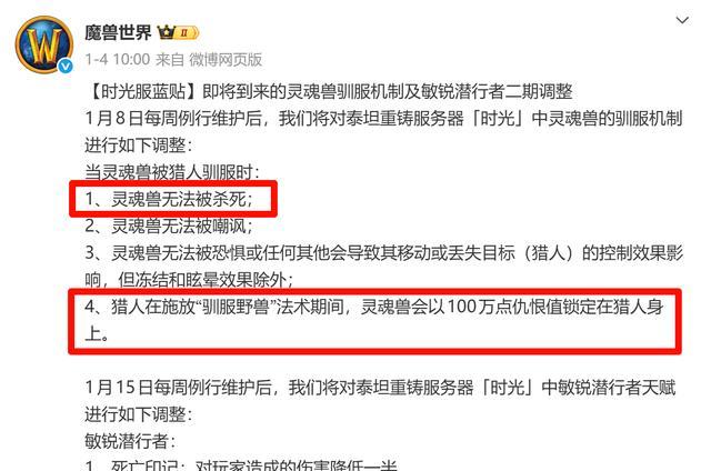 接下来我们看4号的蓝贴,其实4号的蓝贴总结一句话就是保护猎人抓捕灵魂兽,因为我们都知道在抓捕灵魂兽的时候尤其是一些稀有的灵魂兽的时候会出现一些玩家捣乱,比如恶意击败灵魂兽,而这次直接表示灵魂兽无法被击败,确保了猎人可以完美抓捕,其次就是增加一个仇恨锁定,数值这么大估计是怕翻车,所以总结一句话,猎人更好抓捕灵魂兽。