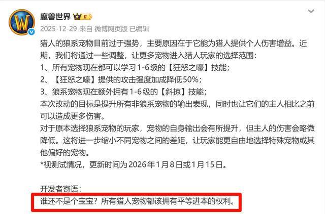 而目前存在最核心的一个问题在于,这次围绕猎人的改动本身是为了纠正狼系宠物一家独大的状况,所以给每个宠物都增加了技能,但是又针对灵魂兽进行特殊优化,好像又背离了初衷,将所有猎人玩家全部逼上了去寻找灵魂兽的道路,让每个宠物都平等进入团本变成了,以后团本只有灵魂兽的局面,未来或许还会纠偏?