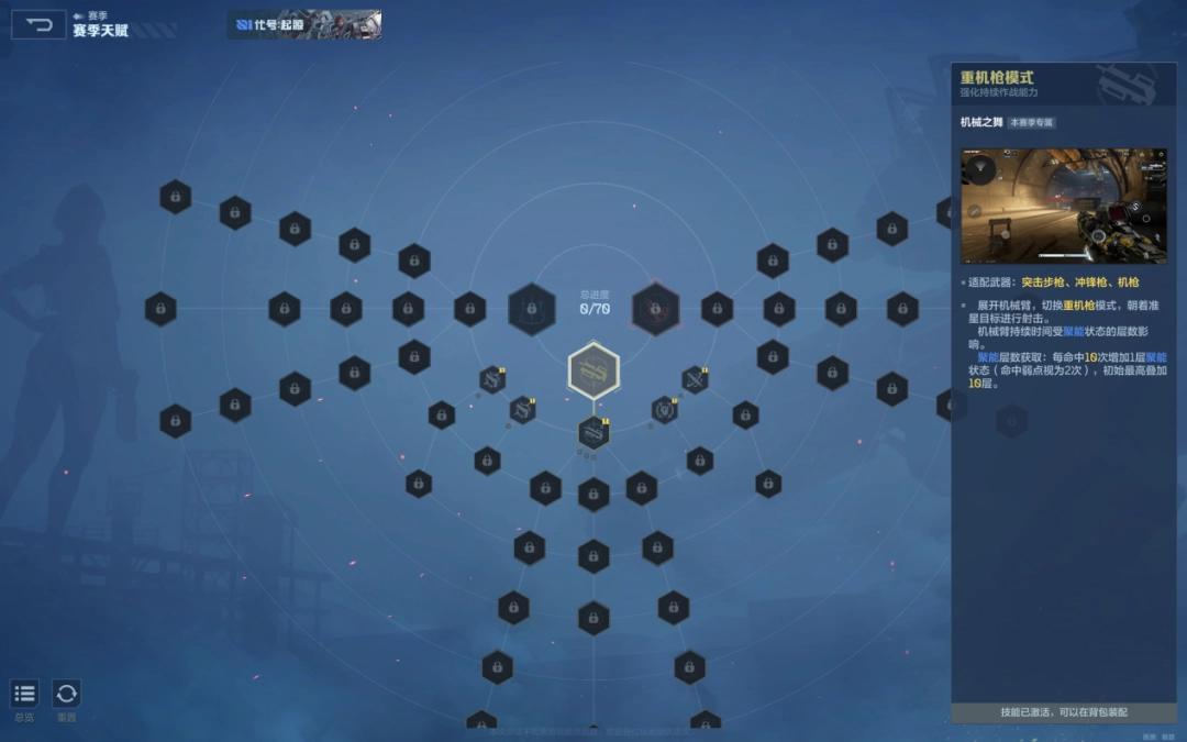 以目前测试服第一赛季的天赋为例,它的赛季核心技能是玩家可以在对局中召唤机械臂辅助战斗。在赛季开始时,玩家可以根据自己惯用的武器,在“重机枪模式”和“轰炸模式”两条天赋路线中择一优先升级,二者的技能表现分别是持续的机枪扫射和快速的飞弹轰炸。前者通过天赋升级后可以解锁重要技能“绚烂烟火”和“死神时刻”,当玩家使用突击步枪、冲锋枪和机枪时,随着武器命中次数的增多,可以不停刷新被动召唤飞弹对敌人造成额外伤害;后者则更强调对敌人的控制效果,发射的飞弹可以冻结敌人,配合榴弹、弓箭和霰弹枪等爆发伤害武器,可以快速成片地控敌并造成爆发伤害。