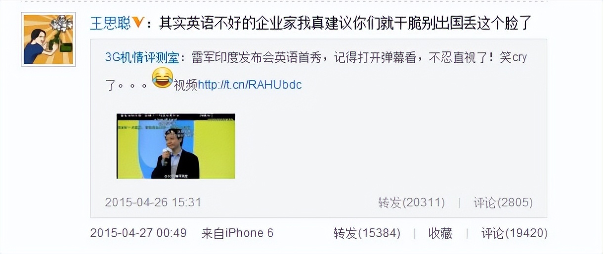 2015年,他公开转发对方的微博,并配文嘲讽: