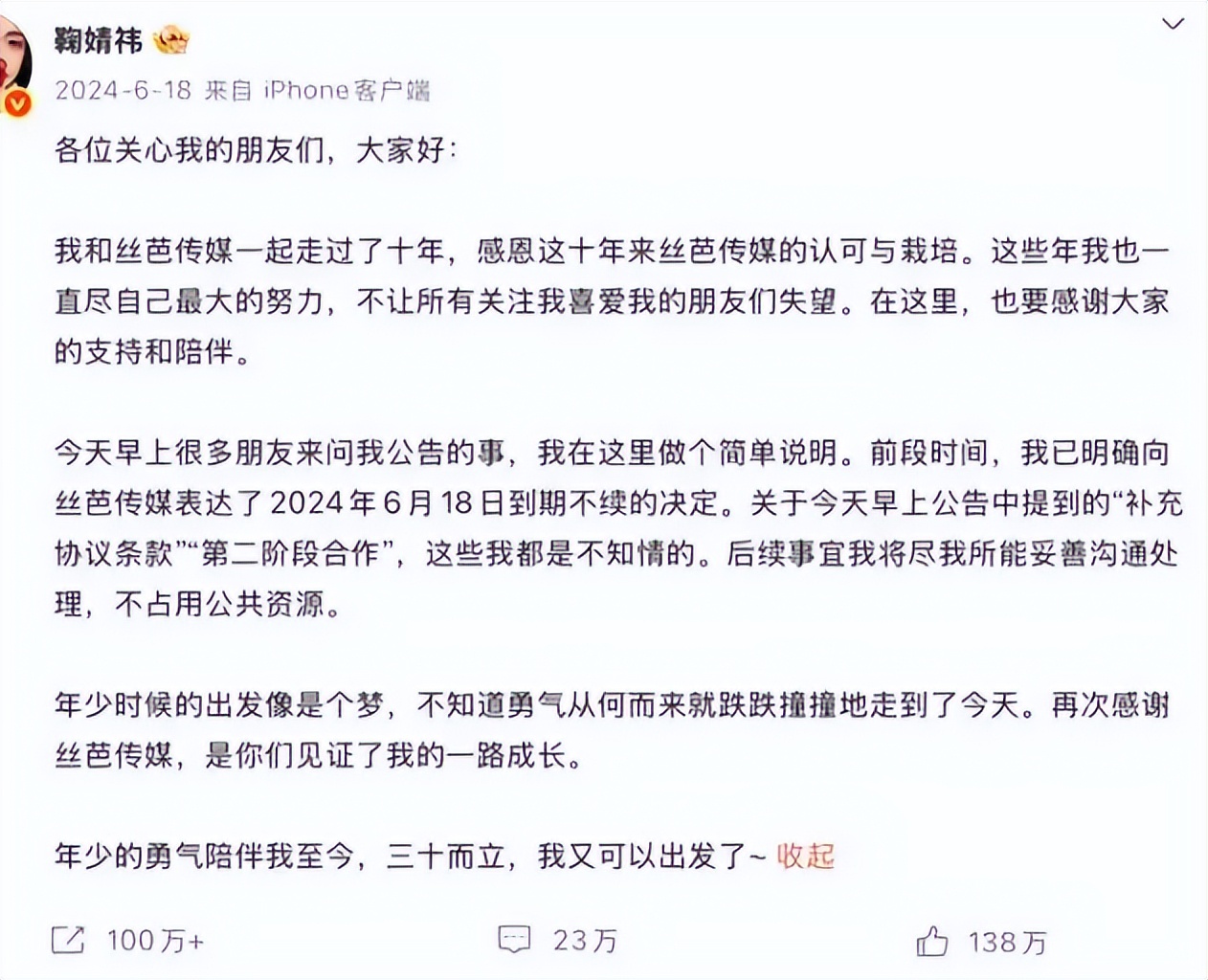 知名演员、歌手鞠婧祎与经纪公司丝芭传媒提出解约。