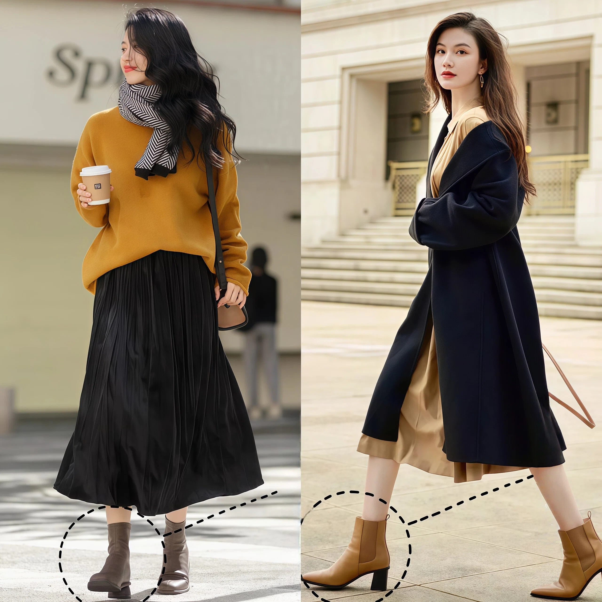 光腿穿大衣,还有一个非常关键的要点,那就是要选对“光腿神器”,可不是让大家直接光着腿穿大衣,否则很容易冻成“老寒腿”。像这种颜色不自然、褶皱感强的光腿神器,赶紧淘汰掉,选择贴合度高、颜色接近肤色的才行!