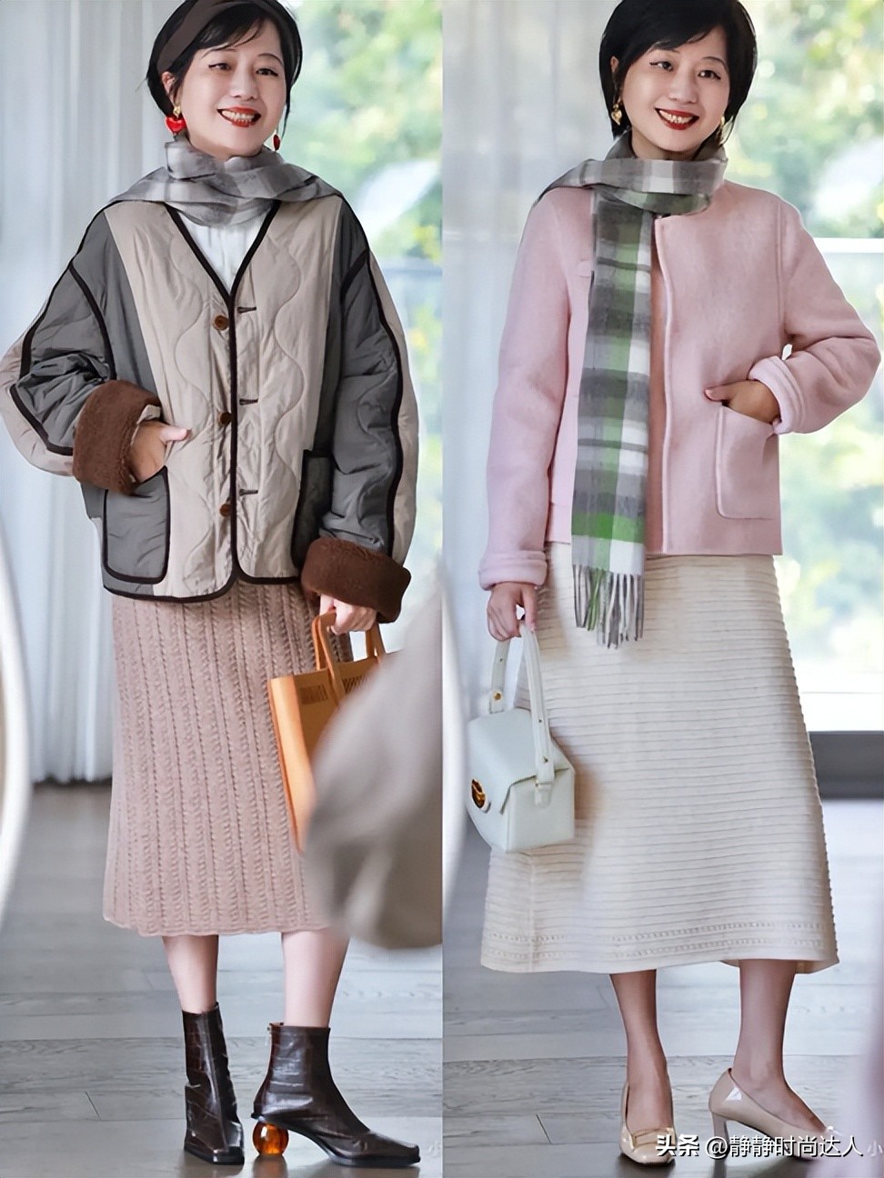比如衣柜里必备的纯色针织衫、直筒半身裙、纯色羽绒服,这些单品永不过时,选款时则需要重点看面料,轻轻松松穿出显贵感。