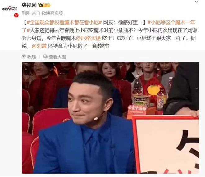 尼格买提变魔术也是一大看点,毕竟去年春晚时小尼变魔术现场直接来了个翻车,今年小尼再次出现在了刘谦老师身边,今年春晚魔术尼格买提终于成功,央视网都直接官方吐槽:偷感好重!