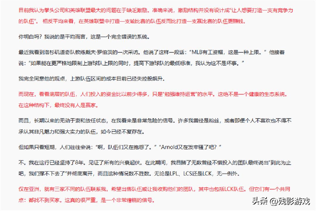 但如今下游队伍的投入却越来越少,只做到了“勉强维持运营”,而上游队伍成本失控般飙升,这种结构下,最终没人是赢家。对此,CEO甚至还爆料了一件事,在他从事这行业8年的时间里,他见过了太多队伍从不惜成本投入,到“到此为止,我们撑不下去了”,最终彻底离开。就只说亚洲这个范围,就已经有三家队伍找他希望出售队伍,让CEO去收购,这里面也有LCK的队伍。因此,他觉得官方应该关注这个问题,赛事转播无法有效盈利,即使这两年拳头削减了电竞大概40%的成本,但LCK却没有相应的调整,LPL倒是有“Rotary”(推测指外部资本注入等特殊结构系统)这种非常独特的体系。
