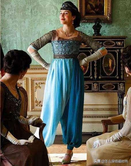 此外,女性服装里的元素开始增多,像阿拉伯、俄罗斯等东方的元素也逐渐体现在女性们的日常穿搭中,如庄园里的三女儿,她就有一套类似裤子形制的裙子,代表着她的"叛逆",对女性自由的追求。